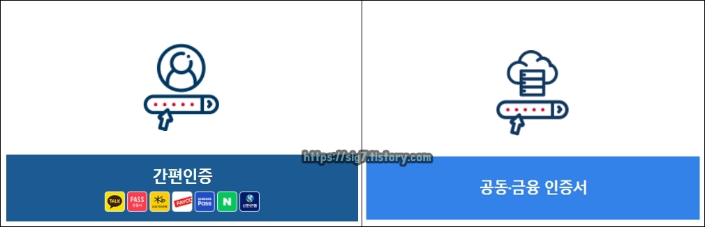 간편인증(카카오톡, 페이코, 네이버 인증 등) 또는 공동 및 금융 인증서를 통해 로그인을 해줍니다.