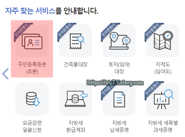 메인 화면 자주 찾는 서비스에 보이는 '주민등록등본(초본)'을 눌러줍니다.