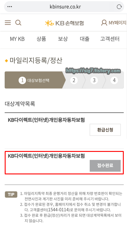 최종 키로 수를 입력한 후, '접수 진행'을 눌러줍니다. 그런데 만약 계기판이 킬로미터(KM)가 아닌 마일(Mile)로 표시된다면 마일을 선택한 후, 입력해주세요.