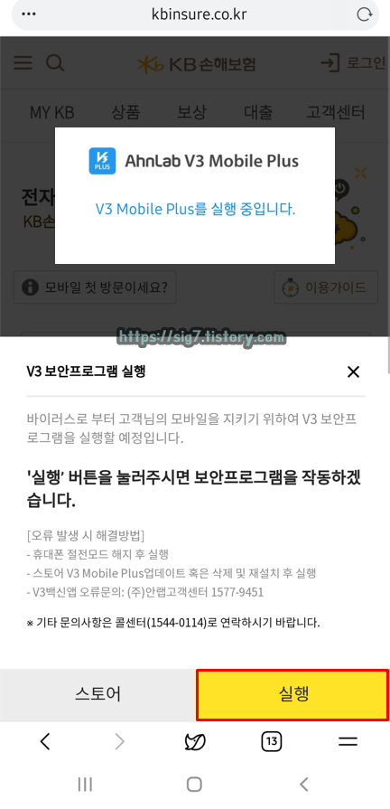 진행 중에 위와 같이 V3 보안 프로그램 실행 창이 뜬다면 '실행'을 눌러주세요.