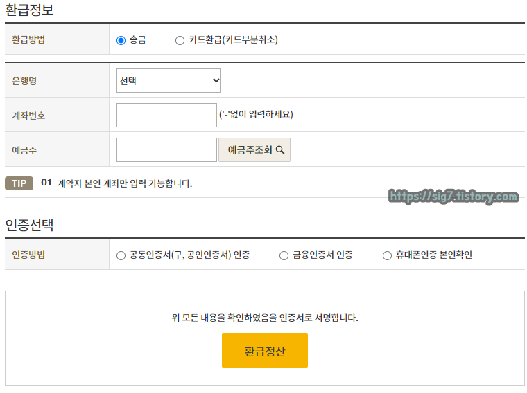 마지막으로 환급 정보를 입력해줍니다. 환급은 송금(계좌이체) 또는 카드환급(카드부분취소)으로 받을 수 있습니다. 환급 정보를 모두 입력했다면 본인 인증 수단을 선택하고, 아래에 보이는 '환급정산 버튼'을 눌러줍니다.