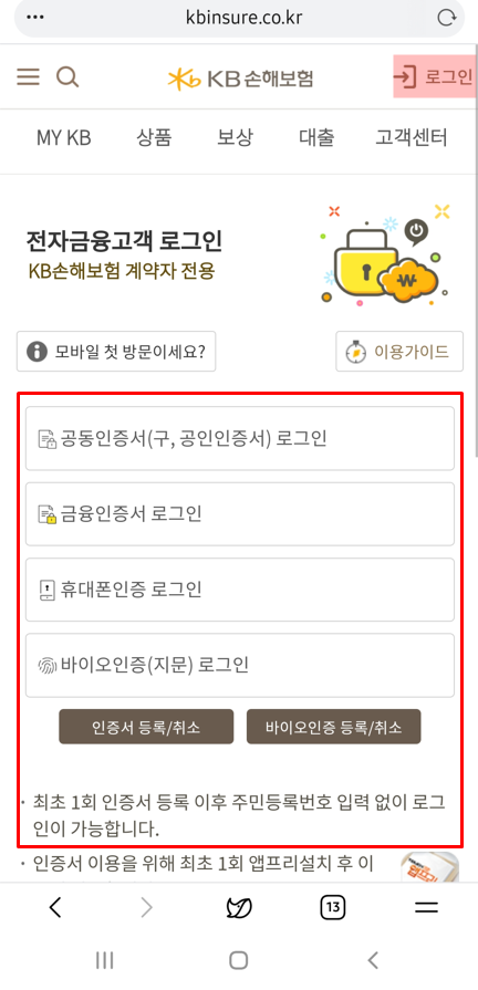 로그인 가능 수단은 공동인증서, 금융인증서, 휴대폰 인증입니다.