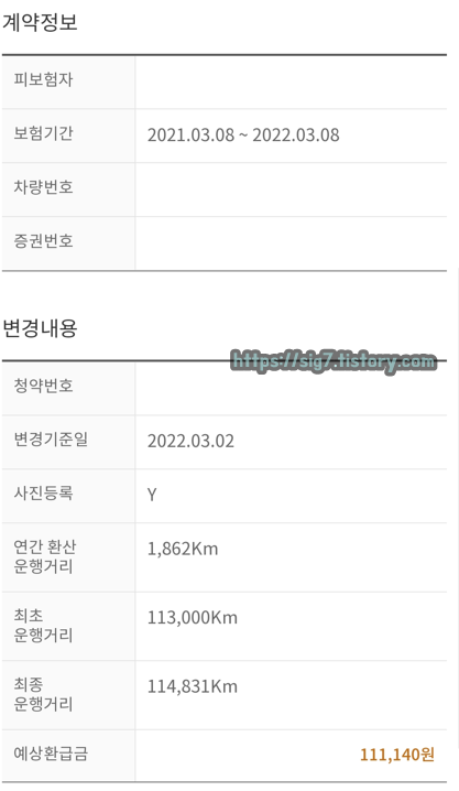 저는 연간 환산 운행 거리가 1,862km로 4천 KM이하에 속하기 때문에 할인율은 무려 30%입니다. 결제 보험료의 30%를 현금으로 환급받을 수 있는 것이죠.