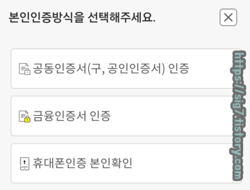 마지막으로 본인 인증을 해줍니다. 본인 인증 가능 수단은 공동인증서(구. 공인인증서), 금융인증서, 휴대폰 인증입니다.