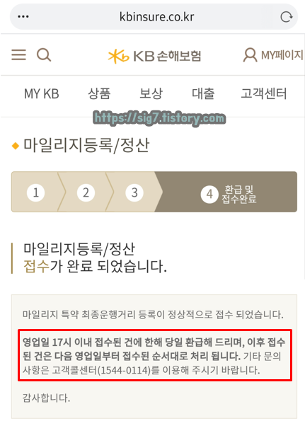 본인 인증까지 완료해주면 이렇게 에코마일리지 환급 신청이 완료됩니다. 접수 완료 화면에서 보니 영업일 17시까지는 당일 환급되고, 이후 접수된 건은 다음 영업일부터 순차적으로 처리된다고 안내해주고 있는데요. 위에서 보셨다면 아시겠지만 PC에서 20시 넘어서 신청을 했었는데 당일 환급이 완료되었습니다. 즉, 영업시간 17시 넘어서 신청을 해도 당일 환급이 될 수 있다는 것이죠.