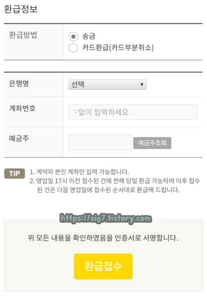 환급 방법(계좌이체 송금, 카드 부분 환급)을 선택한 후, 환급 정보를 입력해줍니다. 모두 입력했다면 아래에 보이는 '환급접수 버튼'을 눌러줍니다.