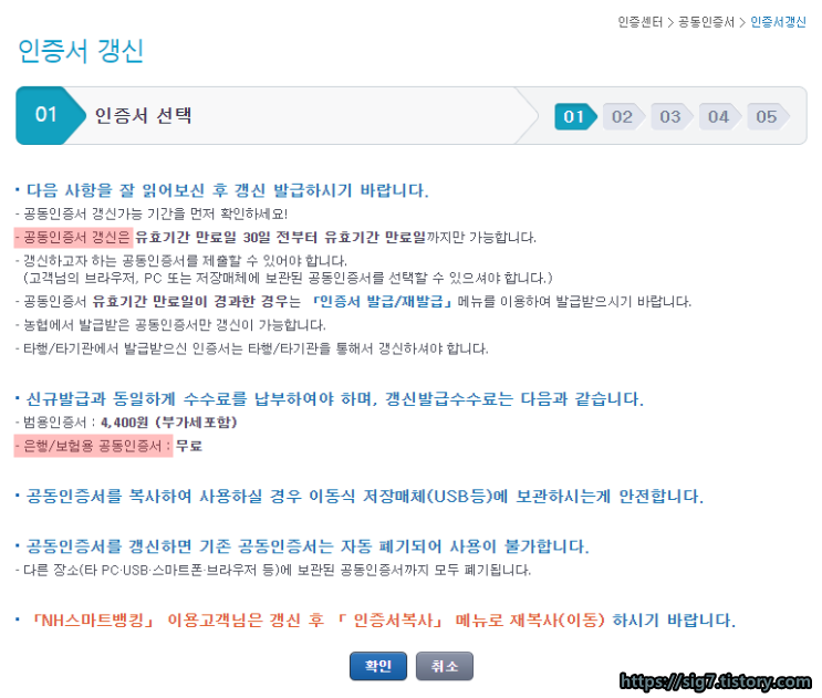 농협 공인인증서 갱신 신청은 유효기간 만료일 30일 전부터 가능합니다. 그리고 대다수 사람들이 사용하는 은행 및 보험용 공인인증서(공동인증서)는 갱신 수수료가 무료입니다.