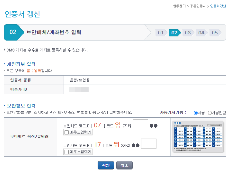 다음은 보안매체/계좌번호 입력 단계입니다. 보안카드의 번호를 입력해줍니다.